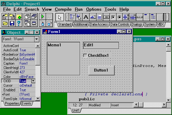 Соответствующий стандарт компонент назывался VBX. И этот стандарт так же поддерживается в Delphi. Однако, визуальные компоненты в Delphi обладают большей гибкостью. Вспомним, в чем была проблема в VB. Прикладной программист программировал, вообще говоря, в среде языка бэйсик. А компоненты в стандарте VBX готовили ему его коллеги-профессионалы на С++.