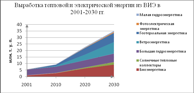 Приоритетного развития в Украине требуют технологии прямого сжигания древесины, в первую очередь для производства теплоты и технологического пара. Это связанно с достаточно низкой ценой на электроэнергию, которая существует в Украине и в то же время - достаточно высокой ценой на топливо и тепловую энергию. Технологии сжигания соломы также являются очень перспективными для Украины. Но широкое распространение этих технологий требует решения ряда вопросов организации сбора, прессования тюков, транспортировки и хранения соломы. Прежде всего, наилучшие перспективы для внедрения на сельскохозяйственных предприятиях имеют фермерские котлы и котлы для малых теплосетей мощностью 0.1-1 МВт. Крупные биогазовые установки также играют важную роль. Их широкое внедрение возможно на свинофермах с поголовьем более 5 тыс., фермах крупного рогатого скота с поголовьем более 600 голов, птицефабриках и предприятиях пищевой промышленности. Производство жидких топлив из биомассы маловероятно в Украине в ближайшее время, так как их себестоимость получается значительно выше стоимости традиционных жидких топлив. Основные усилия в этой области необходимо сконцентрировать на исследовательских и демонстрационных проектах. Считается, что возможная мощность ветровых электростанций в составе централизованной энергосистемы Украины может составлять до 16000 МВт. Коэффициент использования мощности равен 30% (2630 ч/год), - вполне реальный показатель для климатических условий страны, если использовать современные ветроэлектрические установки. В таком случае потенциал использования энергии ветра будет составлять 42 ТВт.ч/год[2]. До 2030г. планируется построить ВЭС суммарной мощностью около 12000 МВт с годовым производством энергии практически 25 ТВт.ч/год. А в период с 2030 по 2050гг. ожидается обновление уже существующих на тот момент ВЭС, чтобы к 2050г. достичь потенциально возможного производства электроэнергии. Украина располагает значительными ресурсами геотермальной энергии, потенциальные запасы которой оцениваются величиной 1022 Дж. Это эквивалентно запасам топлива 3.4.1011 т у.т. Потенциальная мощность ГеоТЭС с учетом извлекаемости запасов и КПД преобразования геотермальной энергии составляет 230 ГВт. Среди районов Украины, перспективных для развития геотермальной энергетики, следует выделить Закарпатье, где по геологическим и геофизическим данным на глубинах до 6 км температуры горных пород достигают 230-2750С. Значительными ресурсами геотермальной энергии располагает Крым, для которого наиболее перспективными являются Тарханкутский и Керченский полуострова, где наблюдаются наибольшие геотермические градиенты, а температура горных пород в этих районах на глубинах 3,5-4 км может достигать 160-1800С. Технические особенности геотермальной электроэнергетики таковы, что основное внимание целесообразно сосредоточить на введении в действие нескольких опытно-экспериментальных ТЭС сравнительно небольшой мощности с целью отработки технологий и соответствующего оборудования. Технически доступный потенциал гидроэнергетики в Украине равен 81 ТВт.ч/год. Суммарный неиспользуемый потенциал достаточно мощных ГЭС равен 18 млрд. кВт.ч., малой гидроэнергетики – до 4 млрд. кВт.ч. В Украине вполне возможно развивать гидроэнергетику, сооружая мощные ГЭС (20-50 МВт), що для мн