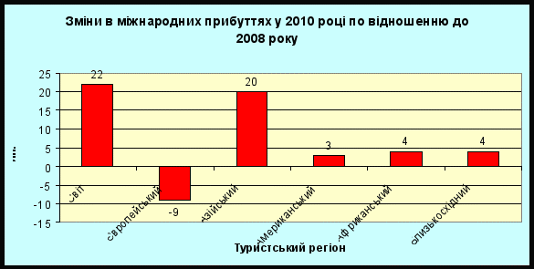 На другій і третій позиції з помітним відставанням від Європи йдуть Азійсько-Тихоокеанський та Американський туристські регіони, на які, відповідно, припадає 21,8% і 16,1% від загальної кількості міжнародних туристських прибуттів у 2010 році. У межах Африканського та Близькосхідного туристських регіонів разом акумулюється 11,6% від усього обсягу міжнародних туристичних прибуттів (табл. 1).