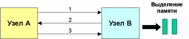 - выделение памяти под передаваемые данные и подтверждение приема пакета от узла А