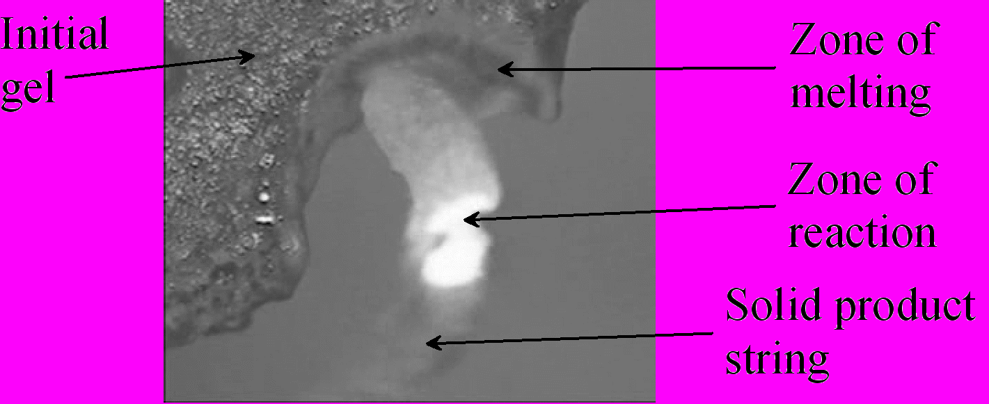 Results have shown complex macrostructure of the combustion wave. Zone of melting propagates ahead of the combustion front. Zone of solid product formation allocates in relatively small (few mm) area, which runs along the combustion front surface. The product grows from this area in a form of friable string. Bright glowing reaction zone locates inside the string (see Figure). Depending on preparation procedure, initial gel possess amorphous or microcrystalline structure, while the combustion product is composed of nano-crystalline oxides.