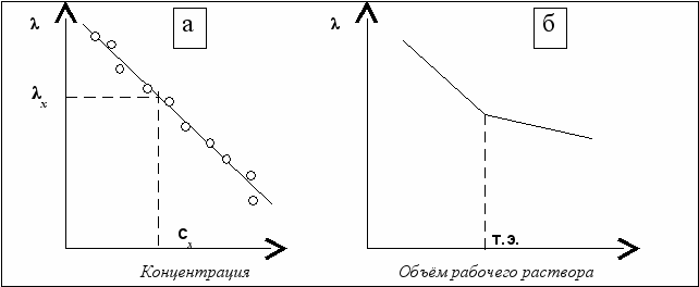 Рис. 6.7. Калибровочный график (а) и кривая кондуктометрического титрования (б)