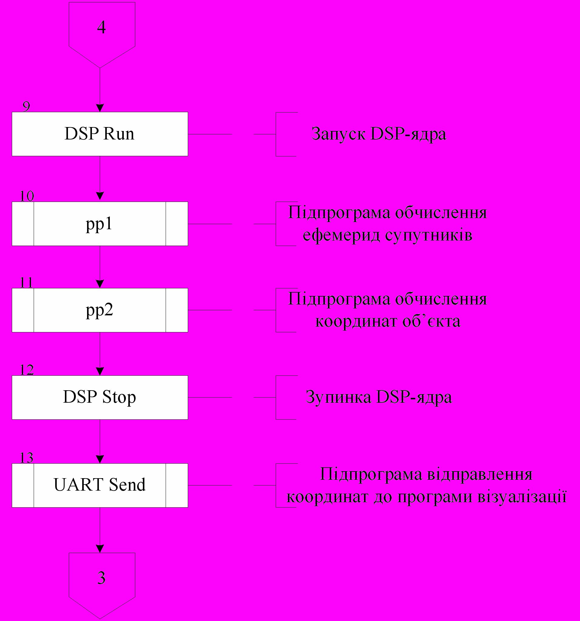 Коли система розпочинає роботу, керуюче ядро RISС мікроконтролера чекає на встановлення активного нижнього рівня сигралу nACK – готовность асинхронної пам’яті. Встановлення цього сигналу говорить про те, що приймальна аппаратура отримала навігаційну інформацію у буфері FIFO. Керуюче ядро розпочинає цикл запису до внутрішньої ОП даних з буфера FIFO блоку приймальної апаратури. Дані приймаються до зняття активного рівня сигналу nACK. Після успішного прийняття інформації, RISС-ядро переводе DSP-ядро обчислювача зі стану STOP до стану RUN. DSP-ядро викону програму з ПП для обчислення координат рухливого об’єкта на базі тих навігаційних даних, які знаходяться на даний момент у внутрішнії ОП мікроконтролера. Після обчислення координат, керуюче ядро переводе DSP у стан зупинки STOP та настроює послідовний інтерфейс для передачи координат об’єкта до програми візуалізації. Цикли приймання навігаційної інформації та обчислення координат повторюється.