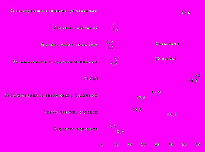 На жаль, ті джерела інформації, що, на наш погляд, були б найефективнішими з питань інформативності й значущості, використовує незначна кількість опитаних. Так, від свого адвоката інформацію отримують лише 3,3 %, під час навчання — 5 %, зі спілкування із правозахисниками — 6,1 %. Найменша кількість опитаних проходили спеціальне навчання, відвідували семінари — 0,7 %.