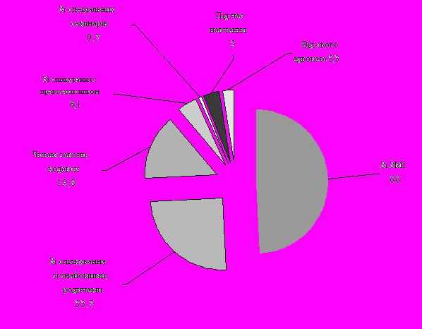 Досить цікаві результати було отримано при аналізі відповідей респондентів на запитання про джерела отримання правової інформації. Вид джерела інформації обумовлює якість та достовірність наданої інформації, а тому дослідження цієї проблеми є дуже важливим.