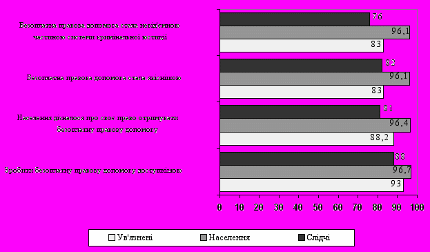 Цікавим є той факт, що серед трьох груп опитаних (населення, в’язнів та слідчих) не більш ніж 10 % згадали про Закон України „Про міліцію”, але ж ч.6 ст.5 цього закону зазначає, що „у разі заяви затриманими або заарештованими (взятими під варту) особами усної або письмової вимоги про отримання захисника працівники міліції не мають права вимагати від них будь-яких пояснень або свідчень до прибуття захисника”.
