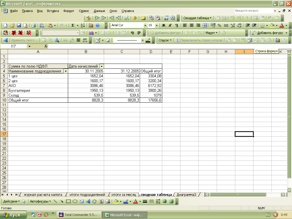 17. Для более удобного расчета общей суммы НДФЛ по каждому подразделению и общей перечисляемой организацией суммы НДФЛ за месяц необходимо создать сводную таблицу. Для этого в меню «Данные» выбираем пункт меню «Сводная таблица». На первом листе мастера сводных таблиц ничего не меняем, нажимаем кнопку «Далее». На втором листе в качестве диапазона для сводной таблицы указываем таблицу «Журнал расчёта налога на доходы с физических лиц» на листе 3, нажимаем кнопку «Далее». На третьем листе выбираем в пункте «Поместить таблицу в: »выбираем «новый лист». Нажимаем «Готово».