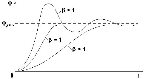 На рис.5.5 представлены графики переходных процессов в системе 2-го порядка при разных значениях степени успокоения : <1 - колебательный режим, >1 - апериодический режим, =1 - критический режим. Изменяя сопротивление цепи прибора (см. уравнение 5.29), можно получить различные режимы его работы.