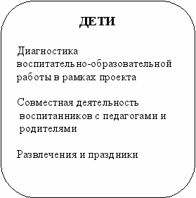 Заключительный (аналитический) 1. Сбор информации: - о качестве реализации проекта педагогами - об уровне усвоения детьми, предлагаемых материалов проекта; - выявление причин, пробелов и отставаний, тормозящих в реализации воспитательно- образовательных задач проекта | Сентябрь 2010г. Октябрь 2010г. – Апрель 2011г. Апрель 2011г. | Руководитель проекта Участники проекта (педагоги) Руководитель проекта Руководитель проекта Руководитель проекта Участники проекта Участники проекта Участники проекта Руководитель проекта Участники проекта |