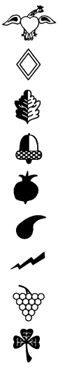 Символы, используемые в хекс-знаках, придают отчетливый акцент общим стpуктуpам, основанным на геометрических фигурах. Каждый рисунок обладает специальным значением, и благодаря этому значению общая сила или энергия знака формируется и обретает окончательную "настройку", необходимую для исполнения воли бpаухеpа. Ниже приведены примеры наиболее характерных символических рисунков и их значения: