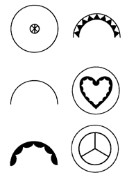2) Символы и геометрические фигуры, дающие очертания различным зонам вселенского круга. Они делятся на три основных типа: символы, украшающие границы между зонами; фигуры, лежащие в основе знаков; и другие символические образы (которые обычно отождествляются с тюльпанами, сердечками и т. п.).