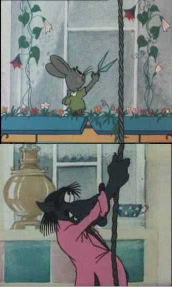 Баба: (виймає колобок з печі) Ну й славний же колобочок вийшов. Нехай полежить, охолоне, а я піду діда погукаю.