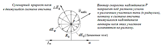 При относительном движении нейтральность латентного поля тока нарушается. Дипольное поле элемента тока не радиально, а вектор скорости наблюдателя направлен под разными углами к различным элементам тока, поэтому поля разных участков тока в движущейся системе отсчета меняются по-разному. Приросты векторов поля в движущейся системе отсчета показаны ниже (чтобы не загромождать, показаны только три вектора из всей розетки векторов поля):