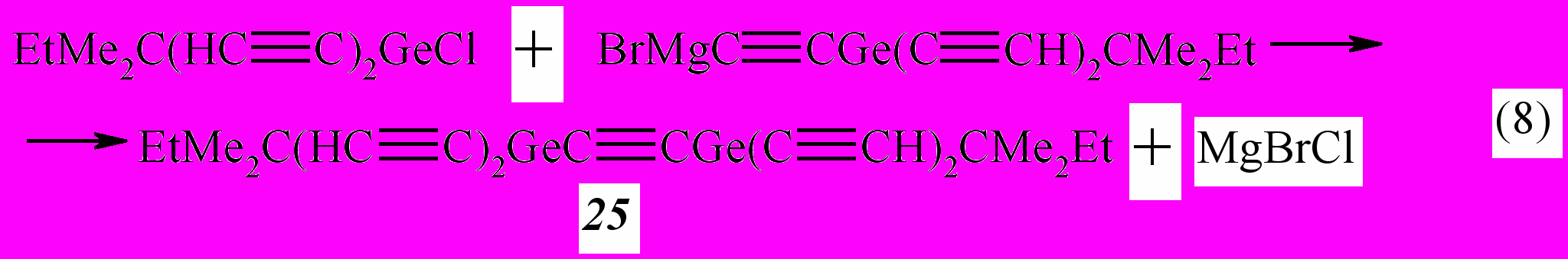 При взаимодействии трет-пентилтрихлоргермана с этинилмагнийбромидом в качестве побочного продукта выделено незначительное количество бис(трет-пентилдиэтинилгермил)этина (25). Очевидно, он образуется за счет содержания в реакционной смеси избытка этилмагнийбромида, который приводит к трет-пентил(диэтинил)(броммагнийэтинил)герману, который, в свою очередь реагирует с частично этинилированным трет-пентил(диэтинил)хлоргерманом по схеме 8.