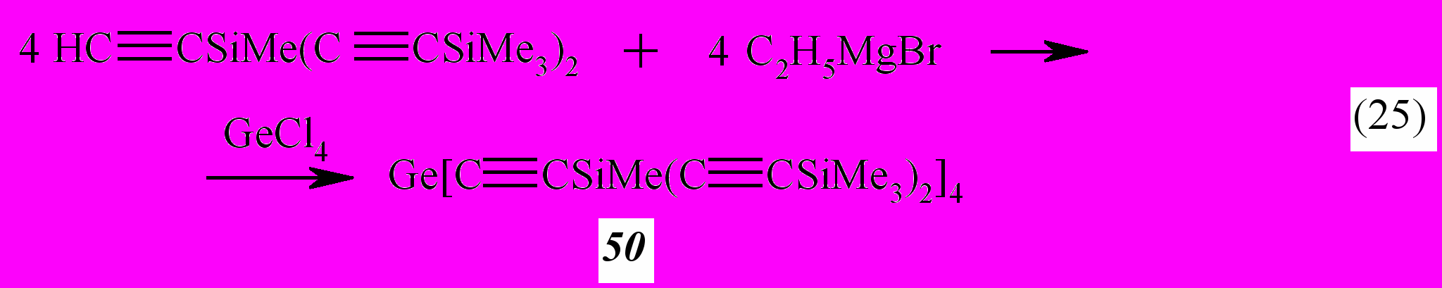 Продуктом реакции метилэтинилбис(триметилсилилэтинил)силана с этилмагнийбромидом и тетрахлоргерманом в среде THF оказался полиненасыщенный четырехветочный дендример с германиевым ядром - тетракис[метилбис(триметилсилилэтинил)силилэтинил]герман (50) (выход 32%) (схема 25).