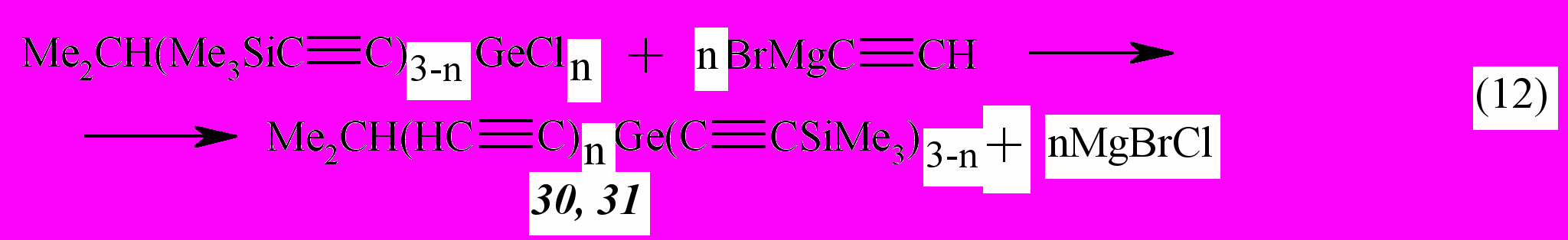 Дальнейшее взаимодействие соединений с этинилмагнийбромидом привело к изо-пропил(триметилсилилэтинил)диэтинилгерману (30) и изо-пропилбис-(триметилсилилэтинил)этинилгерману (31) (72%) (схема 12).