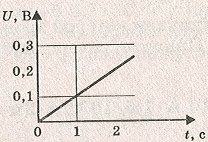 рямолинейный проводник длиной 10 см перемещают в однородном магнитном поле с индукцией 0,1 Тл. Проводник, вектор его скорости и вектор индукции поля взаимно перпендикулярны. С каким ускорением нужно перемещать проводник, чтобы разность потенциалов на его концах U возрастала, как показано на рисунке?