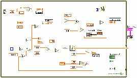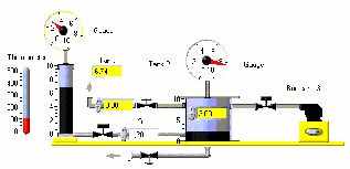 Работа строится таким образом. Вначале выполняются численные эксперименты по исследованию политропных процессов при заданных значениях n = 1,0 - 1,4. Результаты этих вычислений отображаются на «живой» мнемосхеме физической установки, в виде изменяющихся показаний параметров - давления, уровня жидкости в цилиндре, температуры сжимаемого воздуха (рис.1). Полученные результаты анализируются и студентами самостоятельно и делаются выводы относительно изменений давления и температуры в исследованных процессах в зависимости от показателя политропы. Затем проводится реальный физический эксперимент. Для этого вызывается новая программа сбора и обработки результатов и повторяются все действия численного эксперимента. Лицевая панель и блоксхема системы измерения при этом несколько отличаются от используемых ранее.