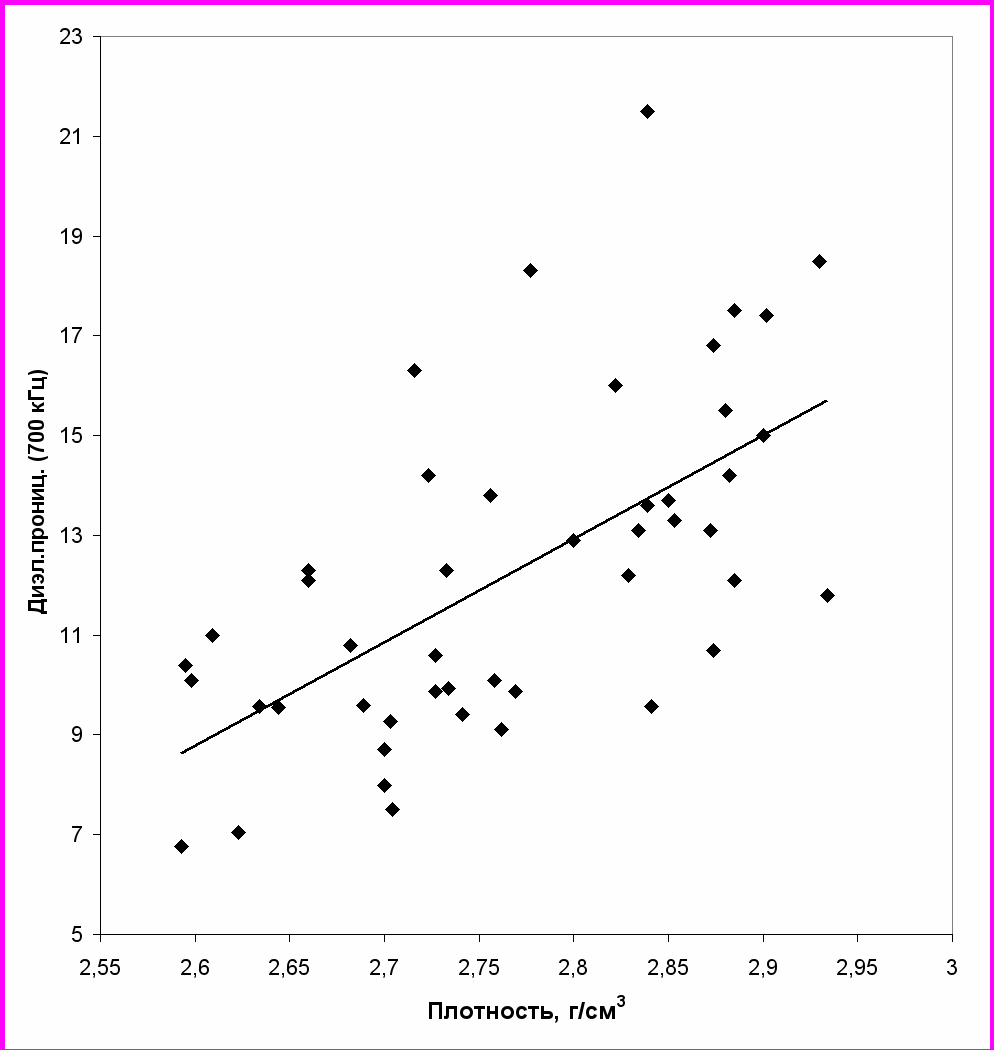 лияние плотности () на магнитные и электрические параметры кристаллических пород островов Аргентинского архипелага представлено в таблице, а некоторые из этих зависимостей – на рис.4, 5. С увеличением плотности примерно от 2,6 до 2,94 г/см3 наблюдается рост магнитной восприимчивости, естественной остаточной намагниченности, диэлектрической проницаемости, коэффициента потерь при разной силе корреляционной связи. Коэффициенты корреляции в этих зависимостях изменяются от 0,33 11=F() до 0,75 In=F(), критерий Романовского – от 2,75 до 4,25. Такие значения r и k свидетельствуют о существенном влиянии плотности на , In, , 11. Для сухих и воздушно-сухих пород в зависимостях диэлектрической проницаемости, измеренной на частоте 1 кГц (1), от плотности более надежными являются корреляционные взаимосвязи, рассчитанные по степенным уравнениям. В первом случае коэффициент корреляции равняется 0,45, критерий Романовского – 3,02, уравнение аппроксимирующей кривой имеет вид: 1=0,0003*11,5, а для воздушно-сухих пород соответсвенно 0,53; 3,56 и 1=0,001*11,3. Более достоверные связи плотности и диэлектрической проницаемости зафиксированы для сухих пород по сравнению с воздушно-сухими. Таким образом, наличие даже незначительного количества влаги в составе пород снижает степень влияния плотности на диэлектрическую проницаемость.Рис. 4. Зависимость 7 сухих пород района станции Академик Вернадский от плотности.