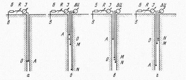 Различные зонды для электрического каротажа скважин: А, В - питающие электроды, Б - батарея или другой источник питания, R - реостат для регулировки силы тока, I - прибор, измеряющий силу тока, MN - приемные измерительные электроды, - прибор для измерения (регистрации) разности потенциалов, О - точка записи, к которой относят результаты замеров; а - одноэлектродный зонд токового каротажа, б - трехэлектродный потенциал-зонд, в - трехэлектродный подошвенный (последовательный) градиент-зонд, г - трехэлектродный кровельный (обращенный) градиент-зонд