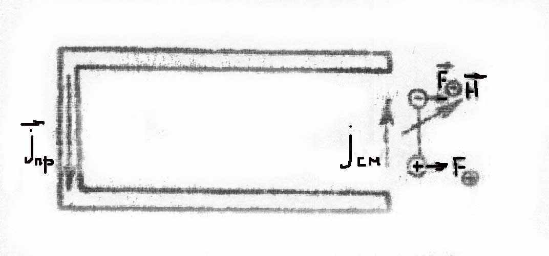 где К - волновое число, L - длина энергетического канала; - комплексная диэлектрическая проницаемость; r0 - радиус канала в определенный момент времени; jm - амплитуда плотности тока в канале; r - расстояние до точки наблюдения; - частота колебаний. Из (16) видно, что амплитуда колебаний напряженности электрического поля зависит не только от расстояния, но и от радиуса, который периодически меняется при пульсации заряда. Интересным фактом является то, что структура "оболочек" вокруг генератора СГ-разряда ( которая оказалась аналогичной структуре "оболочек" человека) сохраняется и при его выключении. Однако эти "оболочки" так же, как и "оболочки" человека, могут быть "размыты" при мысленном воздействии на область их существования. Еще более удивительно то, что мысленно можно создать образ (фантом) человека (и генератора) в определенной области пространства и замерить его с помощью приборов. При "размытии" образ исчезает. Это значит, что волны с продольной компонентой способны как структурировать, так и деструктурировать физический вакуум. Воздействие полей человека и генератора СГ-разряда, моделирующего эти поля, апробировалось на различных живых структурах. Стимулировался и подавлялся ( в зависимости от времени воздействия) рост растений (до 100%), в два раза повышался выход биомассы сине-зеленой водоросли спирулины, увеличивался срок хранения продуктов питания за счет стимуляции иммунных свойств, улучшалась проницаемость мембран клеток крови (увеличивался выброс гемоглобина до полутора раз) и т.п. При воздействии на большие клетки генератора СГ-разряда изменялся биопотенциал и на шлефовом осциллографе возникали периодические резкие "выбросы", как будто бы клетки "впадали в истерику". Воздействие человека оказывалось идентичным воздействию генератора, когда человек подстраивался под его режим. Однако если мысленно задавалась программа "успокоения", то "выбросы" быстро снижалась. Это свидетельствует о том, что сигналы мозга могут быть определенным образом модулированы, что обеспечит нужную программу. Взаимодействие процессов, происходящих в вещественном мире, с физическим вакуумом лежит в основе так называемого "безрасходного двигателя, разработанного независимо друг от друга В.И.Докучаевым и В.П.Глушко. Двигатель - это, в принципе, разомкнутая на одном конце прямоугольная петля, по которой протекает переменный ток. Как показали эксперименты, петля перемещается в сторону, противоположную разомкнутому концу, где ток проводимости замыкается током смещения. Чем можно объяснить это явление? Взаимодействием токов проводимости с токами смещения? Но ведь токи должны при этом взаимно отталкиваться. Ток в проводе... это понятно, так как провод материален, а что обеспечивает реактивную силу на другом конце? Логично объяснить это опять-таки существованием виртуальных диполей, которые в переменном магнитном поле, создаваемом током проводимости в петле, ориентируются, создавая ток смещения на её открытом конца. В самом деле, электроны в магнитном поле должны вращаться по ходу часовой стрелки, а позитроны - против (рис.4). Следовательно, силы, действующие на позитроны и электроны, направлены в одну сторону, что приводит к выталкиванию диполей из петли и обеспечивает возникновение реактивной силы. Сам факт ускорения разомкнутой петли неопров