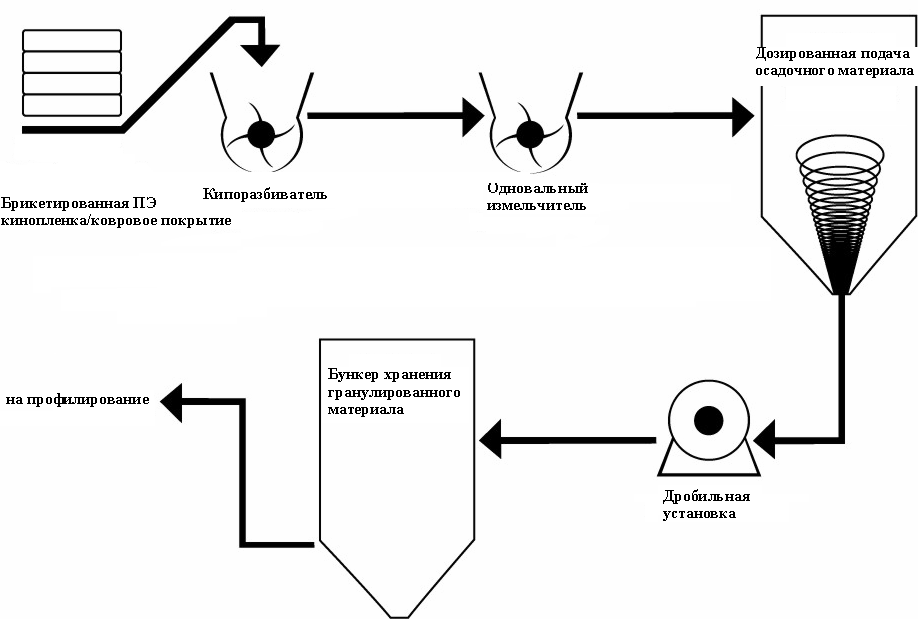 Схема технологического процесса включает линию переработки пленочного пластика и/или ковровых покрытий вместе с отдельной линией для жесткого пластика. Линия, предназначенная для полиэтиленовой кинопленки/ковровых покрытий, начинается с конвейера подачи брикетированного материала на кипоразбиватель. Затем следует одновальный измельчитель, который дробит материал до нужного размера и консистенции, а также способствует отделению всех примесей и загрязняющих составляющих. Осадочная пыль, ворс собираются в системе хранения, откуда материал подается дозами на модификатор для пресс-гранулирования. Уже гранулированный материал направляется в бункер для хранения (силос), откуда осуществляется подача каждого из компонентов исходного сырья на профилирование.