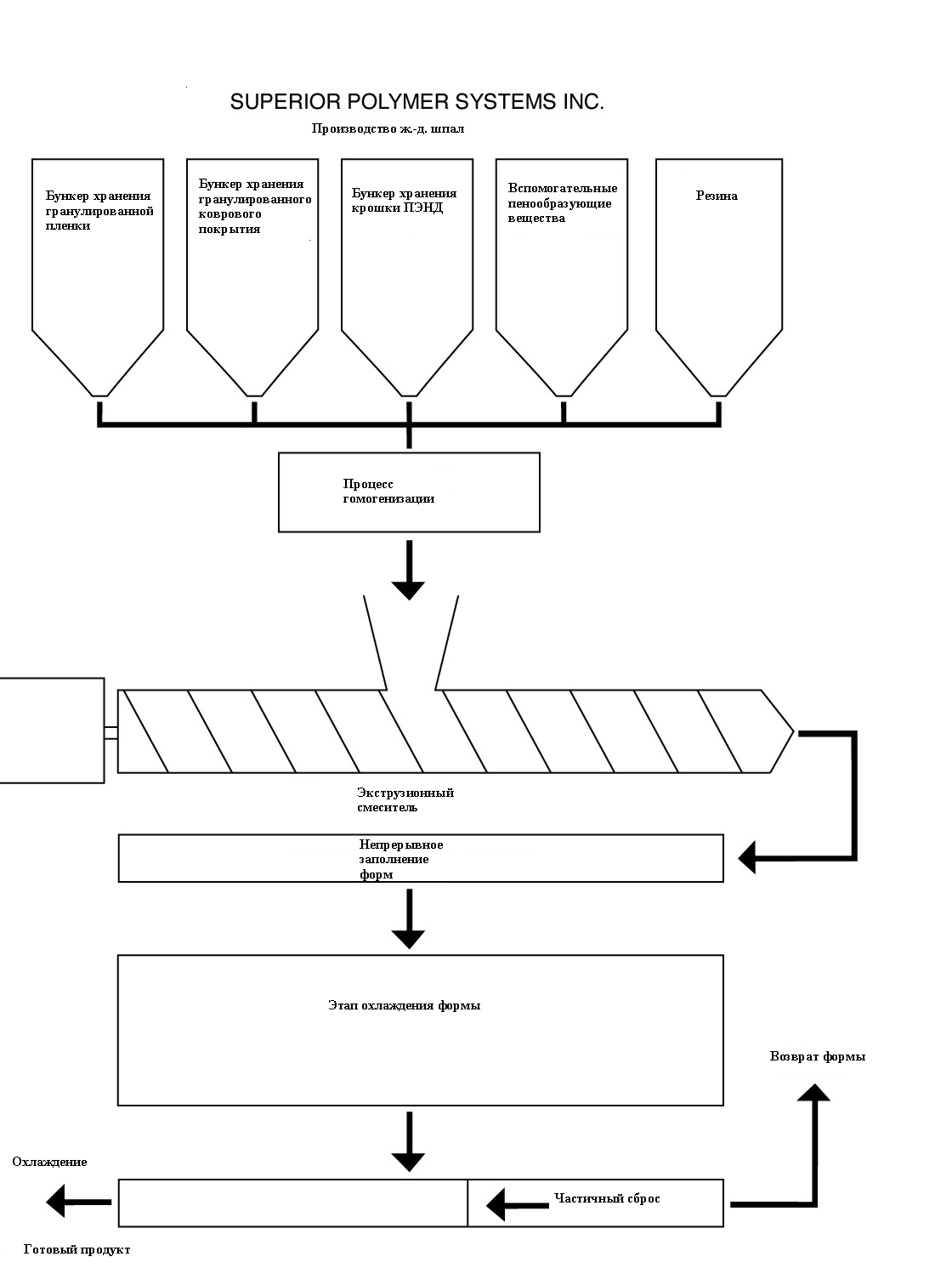 Предварительно подготовленная смесь подается на экструзионный смеситель, который питает станцию непрерывного наполнения форм. Смеситель отрегулирован на постоянную скорость, а полимерная смесь подается путем вливания в большую одиночную форму через станцию питания. Данная станция имеет автоматический клапан-переключатель, который регулирует поток полимерной смеси от наполненной формы к ожидающей. Данная процедура выполняется без изменения скорости и как следствие перепада давления в смесителе. Формы оснащены системой компрессии, которая сохраняет размер готового изделия без ??? (массового внутреннего пропуска???). После наполнения автоматическая система транспортировки отсоединяет формы и последовательно проводит их через водоохладительную ванную, размер которой позволяет производить одновременное охлаждение большого количества форм и тем самым сэкономить часть времени на кристаллизацию/ затвердение, которая может занимать больше часа. Автоматизированная система наполнения форм и их транспортировки позволит производить ж.-д. шпалы со скоростью одна шпала в минуту. В конце охладительного цикла, готовые шпалы извлекаются из форм, которые затем снова направляются на автоматизированную станцию наполнения. Затем изделия подвергаются воздушному охлаждению и ротации с целью предотвращения деформации формы.