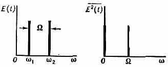 Если А, , 1, и 2 не зависят от времени, то спектры Е(t) и Е2(t) имеют вид, изображённый на рис. 2. Спектр Е2(t) состоит из пост. составляющей (0=0 и разностной частоты =|1-2|. Т. к. каждая линия дублета имеет спектр, ширину , то реальные спектры Е(t) и E2(t) имеют вид, изображённый на рис. 3. Максимум в спектре E2(t) лежит вблизи разностной частоты и имеет ширину порядка ширины компонентов дублета.