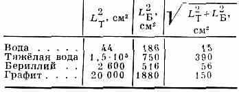 Диффузия тепловых нейтронов характеризуется коэфф. диффузии D и ср. квадратом расстояния L2T от точки образования теплового нейтрона до точки его поглощения: L2T=6Dt, где t — ср. время жизни теплового нейтрона в среде (табл.). Диффузию быстрых нейтронов характеризуют ср. квадратом расстояния l2б между точкой образования быстрого нейтрона