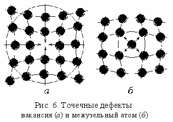 1) Точечными называют дефекты, которые малы во всех трех пространственных направлениях, т. е. соизмеримы с межатомным расстоянием. Это вакансии, межузельные атомы, примеси замещения и внедрения.