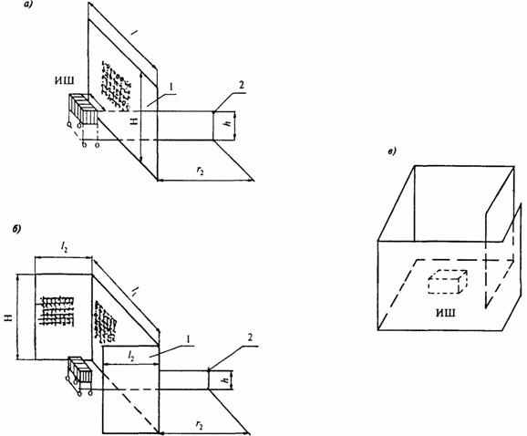 а - плоский; б - П-образный; в - выгородка; ИШ - источник шума; 1 - экран; 2 - расчетная точка