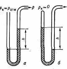 1 Па)] измеряемое давление или разность давлений уравновешивается давлением столба жидкости. В. представляет собой U-образную трубку, заполненную жидкостью (Hg или вакуумные масла). В одном из колен трубки находится газ при измеряемом давлении р, в другом — при известном давлении рк. Разность давлений в коленах уравновешивается столбом жидкости высотой h, т. е. (р-рк)=gh, где — плотность жидкости, a g — ускорение свободного падения. Применяют В. с открытым и закрытым коленом (рис. 2). В первом случае рк=ратм и измеряется разность между атмосферным и измеряемым давлениями. Во втором случае рк приравнивается к нулю и измеряется абс. давление газа. Масляные В. более чувствительны, т. к. плотность масла примерно в 15 раз меньше плотности Hg (но масла хорошо растворяют газы).