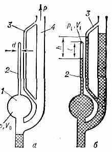 Снизу вводится жидкость (обычно Hg), к-рая отсекает в объёме V0 газ при измеряемом давлении р и затем сжимает его в малом объёме V1 запаянного капилляра до давления р1>>р. Давление p1 определяется по разности уровней h жидкости в капиллярах, а измеряемое давление р — из соотношения: