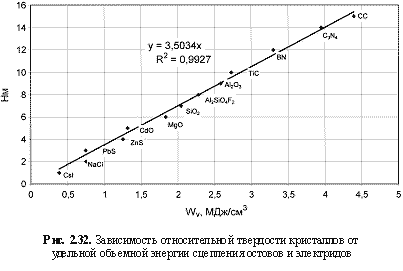 1. Температура плавления (Тпл., К), твердость относительная (НМ) и абсолютная (HV, кгс/мм2), скорость звука в кристаллах (v, км/с), коэффициенты теплового линейного (αl, 10-6xK-1), объемного (αv, 10-6xK-1) расширения и сжимаемости (β, 10-12×Па-1), модули Юнга (Е, ГПа), сдвига (G, ГПа) и всестороннего объемного сжатия (К, ГПа), теплопроводность (λ, Вт/(мxК)), свободная поверхностная энергия (Eshkl, Дж/м2), показатель преломления (n), трещиностойкость (К1с, МПаxм1/2), эффективная энергия разрушения кристаллов (γ, Дж/м2) пограничная межатомная электронная плотность (ρmin, e-/Å3), работа выхода электрона (φ, эВ) - гораздо лучше коррелируются с параметрами удельной объемной энергии сцепления остовов и электридов Wv, нежели с параметрами удельной массовой энергии сцепления остовов и электридов Wm, о чем (как показали расчеты) однозначно свидетельствуют более высокие величины достоверности аппроксимации (R2) соответствующих зависимостей (см. рис. 2.31-2.48):