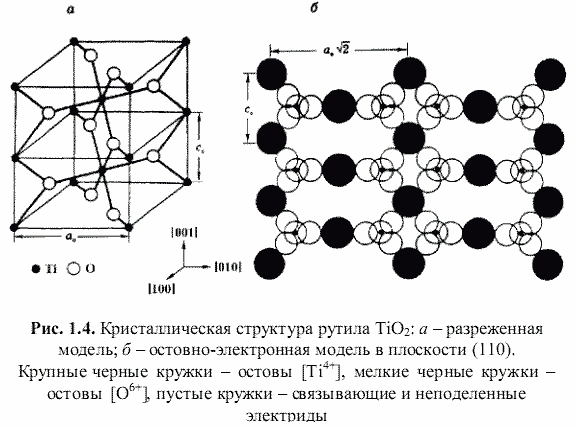 αR = 1,89 - (2/4 + 4/2)/6 = 1,473. Для периклаза MgO (с двумя остовами и шестью электридами) получается такая же величина αR = 1,89 - (2/6 + 6/2)/8 = 1,473. Если (см. рис. 1.6) неподеленную пару электронов включить в остов атома кислорода, то остовно-электронная модель кварца будет |[Si4+](3e-)4[O4+]2|, и в этом случае αR = 1,89 - (1/4 + 2/2 + 4/2)/7 = 1,426.