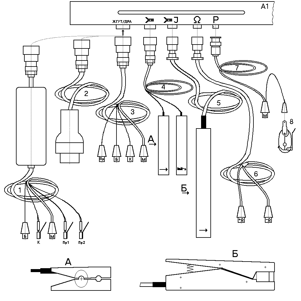 Жгут 3 объединяет четыре провода и заканчивается четырьмя зажимами с обозначениями: “Б”, “М”, “К”, “Пр”.