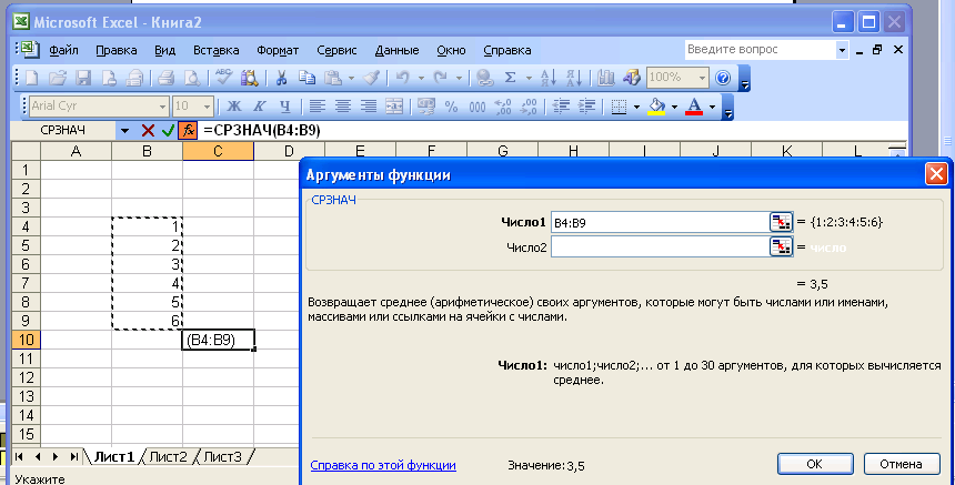 этом списке сначала выберите категорию в списке Категория и затем в алфавитном порядке Функция укажите нужную функцию. Чтобы ввести функцию, нажмите ОК или клавишу {Enter}. Excel введет знак равенства (если вы вставляете о в начало формулы), имя функции и пару круглых скобок. Затем Excel откроет нужно диалога мастера функций (без строки заголовка), показанное на рис. 12.2. Второе окно диалога мастера функций содержит по одному полю для каждого аргумента выбранной функции. Если функция имеет переменное число аргументов, это окно диалога увеличивается при вводе дополнительных аргументов. Справа от каждого аргумента отображается его текущее значение ({1:2:3:4:5:6}). Текущее значение 1 отображается в нижней части этого окна диалога (Значение: 3,5). После нажатия ОК или клавиши {Enter} созданная функция появится в строке формул. Как в любую формулу, в функцию можно вставить ссылки на ячейки и имена. Например, чтобы ввести в ячейку С10 функцию, которая усредняет значения в диапазоне, сначала выделите ячейку С10 и введите функцию СРЗНАЧ. Затем выделите и В4:В9. Вокруг выделенных ячеек появится подвижная рамка, а в строке формул вставлена ссылка на выделенный диапазон (рис. 12.3). После нажатия кнопки ОК или клавиши {Enter} созданная функция появится в роке формул.Р