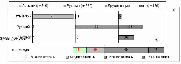 (4) Функциональная интеграция. Одна из ипостасей интеграции — это функциональная интеграция (Karklins, 2000), которая касается способности вступать в общение с другими членами общества. Центральная роль здесь отводится языку, его знанию и сферам употребления. Латыши в форме предположения одной из стратегий формирования этнических отношений называют готовность изменить доминирующую сегодня модель общения. А именно: в общении с русскоязычными не переходить на русский язык, а использовать латышский, тем самым содействуя интеграции русскоязычных. Что касается нелатышей, приходится сделать вывод, что им трудно описать какие-либо стратегии ослабления этнополитической напряженности или формирования этнических отношений. Это можно объяснить тем фактом, что в целом нелатыши оценивают этнические отношения скорее в позитивных категориях, а вот этнополитику — в негативных. Таким образом, основная стратегия, вытекающая из их мнений, — это компромисс, направленный на проведение такой этнополитики, которая отвечает их интересам и возможностям. В результате углубленного исследования данных удалось выделить следующие стратегии нелатышей: