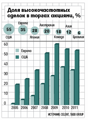 На высокочастотную, или высокоскоростную, торговлю сейчас приходится около половины торгов на фондовом рынке США и 35% — на европейских рынках (см. график). Европейская ассоциация трейдеров, торгующих на собственные средства (FIA European Principal Traders Association), объединила три крупные нидерландские фирмы — Optiver, IMC и Flow Traders, американскую Getco и др. Похожая организация была образована в прошлом году в США при Ассоциации участников фьючерсной индустрии (FIA). FIA представляет интересы банков и брокеров, регулирование которых меняется в связи с принятием ряда законов, таких как закон Додда — Франка о реформировании финансового сектора США. Европейская «группа создается в тот критически важный момент, когда в Европе, США и по всему миру политики принимают новые законы, направленные на изменение прежнего способа работы наших рынков», заявил президент FIA Джон Дамгард.
