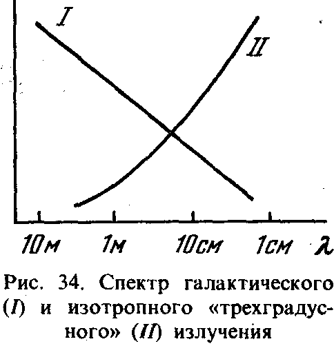 Однако самый выдающийся вклад в космологию радиоастрономия сделала в 1965 г. когда при испытании новой, весьма чувствительной приемной радиоаппаратуры в лаборатории Бэлла (США) на волне около 7 см был обнаружен совершенно новый тип космического радиоизлучения, интенсивность которого со всех направлений на небе была одинаковой. На более длинных волнах это излучение наблюдать затруднительно, так как оно «маскируется» более интенсивным радиоизлучением Галактики и Метагалактики. Дело в том, что, как показали дальнейшие наблюдения на. других волнах сантиметрового диапазона, интенсивность этого излучения растет с ростом частоты пропорционально квадрату последней, между тем как интенсивность галактического и метагалактического синхротронного радиоизлучения довольно быстро падает с ростом частоты (рис. 34).