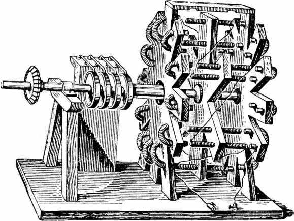 Вырезы были заполнены изолирующими вкладками, каждое кольцо было смещено на 45° по отношению к предыдущему. По окружности кольца скользил рычаг 5, представлявший собой своеобразную щетку. Второй конец каждого рычага был погружен в соответствующий сосуд с ртутью 6, к которому подводились проводники от батареи (сосуды с ртутью являлись наиболее распространенными в начале XIX в. контактными устройствами). Таким образом, при каждом обороте кольца четыре раза разрывалась электрическая цепь. К электромагнитам вращающегося диска отходили от колец проводники, укрепленные на валу машины. Обмотки I всех электромагнитов неподвижной рамы были соединены последовательно и обтекались током батареи в одном направлении. Обмотки электромагнитов вращающегося диска II были также соединены последовательно, но направление тока в них с помощью коммутатора изменялось 8 раз за один оборот вала. Следовательно, полярность этих электромагнитов также изменялась 8 раз за один оборот вала, и эти электромагниты поочередно притягивались и отталкивались электромагнитами неподвижной рамы.