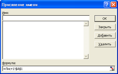 Имя – это легко запоминающийся идентификатор, который можно использовать для ссылки на ячейку, группу ячеек, значение или формулу. Создать имя для ячейки можно в поле имени, или через меню «Вставка\Имя\Присвоить» (рис. 4).