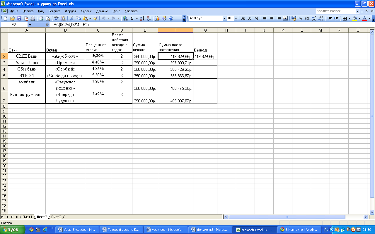 | 5 | Самостоятельна работа учащихся | Сейчас Вам предлагается решить следующую проблему: : К Вам как к грамотному специалисту по обработке финансовой информации обратился ваш хороший знакомый. У него получилось накопить 350 000 рублей, но этой суммы недостаточно для задуманной покупки. Поэтому он решил положить уже накопленные деньги в банк на 2 года, так как проценты по вкладам выше ожидаемой инфляции, то есть, возможно, получить реальные накопленные проценты, кроме того это безопаснее и надежнее чем хранить крупную сумму денег дома. Информация по банковским предложениям собрана и ваш знакомый пришел к вам с этой информацией. Ваша задача выполнить необходимые расчеты и выбрать наиболее выгодный вариант. Вы как грамотный специалист примените финансовые функции Excel, тем более никакого другого программного обеспечения под рукой нет. Откройте файл «Выгодный вклад», который находиться в папке вашего класса. Заполните таблицу необходимой информацией (она представлена в виде таблицы Word). При создании вывода используйте функцию МАКС. (Во время выполнения работы учитель делает замечания, уточнения индивидуально каждому, следит и проверяет правильность хода работы) | 15 мин | |