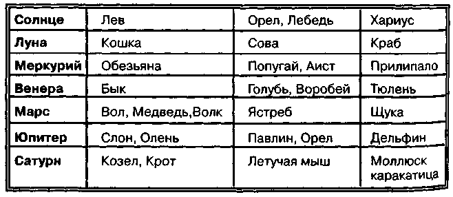 Далее приведена таблица соответствий влияния планет на животное царство.