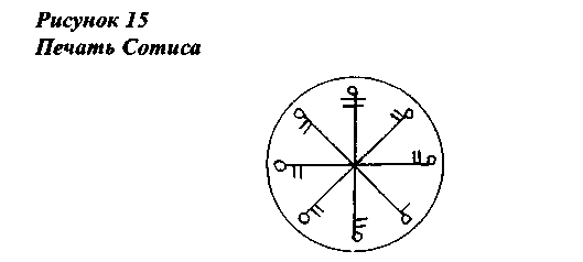 (Печати гениев деканов взяты мной из копии с рукописи семнадцатого века, но безусловно имеющую более древнее происхождение. По мнению Бринквита она была написана 1463 -1518/26 годах. Рукопись выполнена на греческом языке и посвящена иудейско-греческой, герметической традиции сил влияния деканов. К великому сожалению рукопись страдает дефектами, местами подписи гениев деканов трудно различимы, а часть из них безвозвратно утрачена временем).