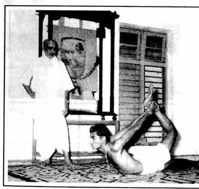 Кришнамачарья со своим сыном, Шрибхашьямом, демонстрирующим ардха-дханурасану.
