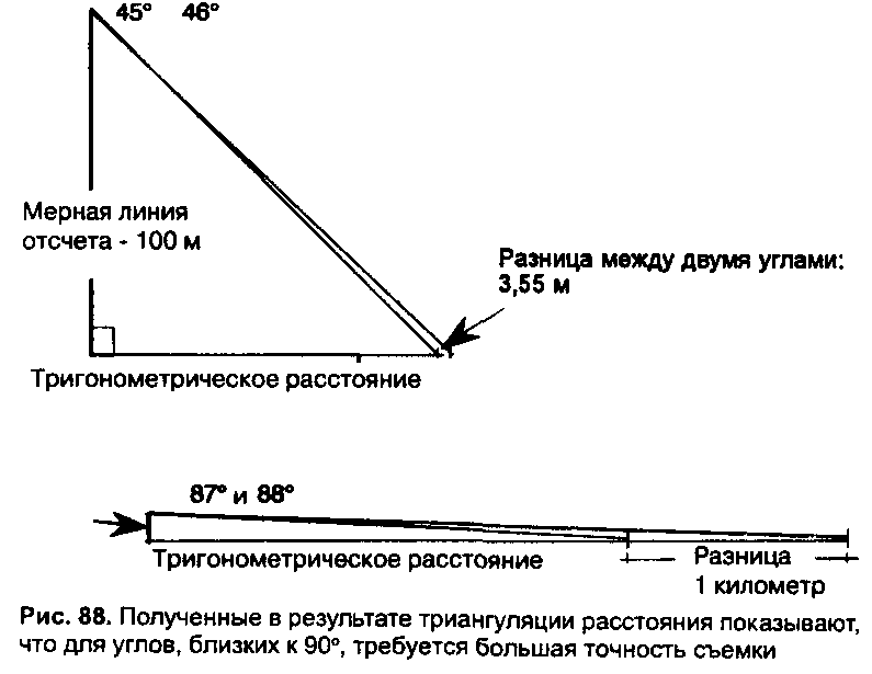 В триангуляции лучшими считаются углы, близкие к 45°. Если взять 100 метров (320 футов) за длину реперной линии в прямоугольном треугольнике, то разница в дли не, произведенная углами в 45 и 46 градусов, составит только 3,55 метра (11,64 фута). Вдругом конце шкалы раз ница в длине, произведенная углами в 87° и 88° на осно ве той же реперной линии в 100 метров (328 футов), со ставит почти километр (рис. 88).