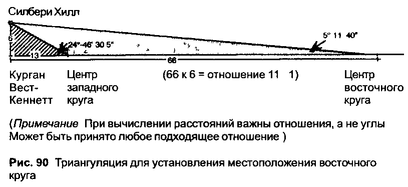 Исходной точкой круга должна была быть линия ви зирования между продолговатым курганом Ист-Кеннетт и центром круга. После определения этих двух мест мог ли быть вычислены и сняты все остальные объекты при условии, что использовались правильные внутренние углы и были известны отношения, на которых они были по строены.