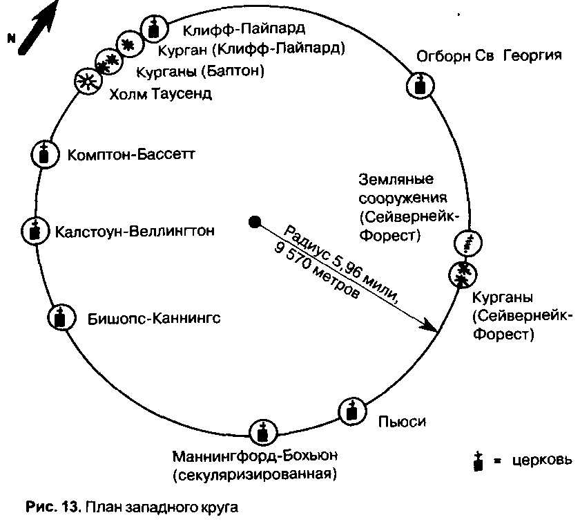На этот раз я проделал тот же математический ана лиз, что и в случае первого круга. Второй круг дал сред ний радиус в 9570 метров (31 390 футов) — менее, чем на семь метров короче 9576,78 метра, числа, вычислен ного мною как 1/666 часть радиуса Земли на экваторе. Вдобавок я обнаружил, что церковь в Бишопс-Каннингс расположена на одной линии с центрами обоих кругов (рис.14).