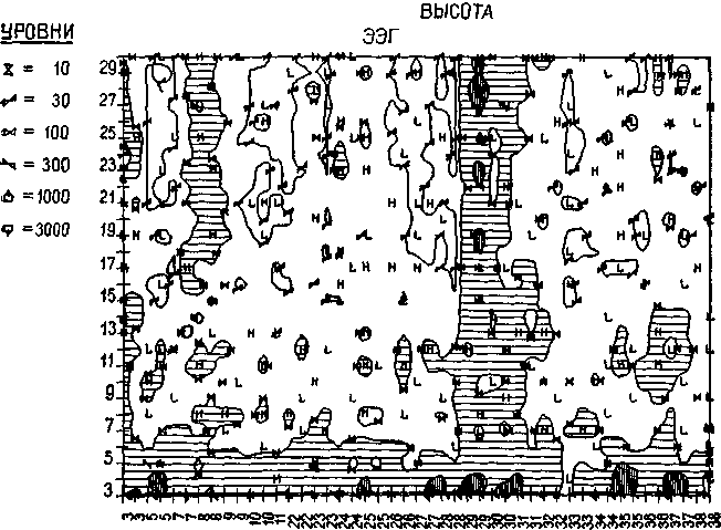Рис. 1-16. Диаграмма, показывающая зависимость ЭЭГ космонавта Ф. В. от высоты подъема в камере, имитировавшей полет «Джеминай». Соотношение было исследовано на протяжении 70-минутного периода времени, в течение которого было сделано 40 записей. Каждая из них длительностью 20 мин. Обратите внимание на характеристику волнового фронта диаграммы и сравните ее с диаграммой на рис. 1-6 (Adey, 1967).